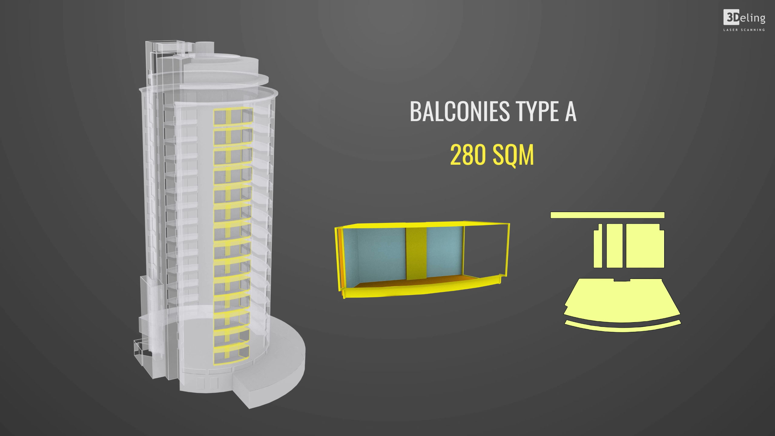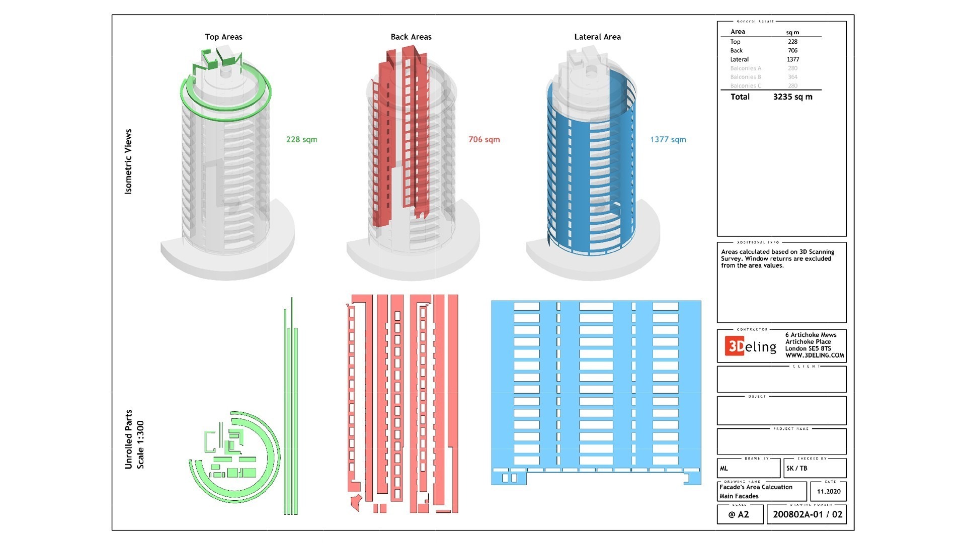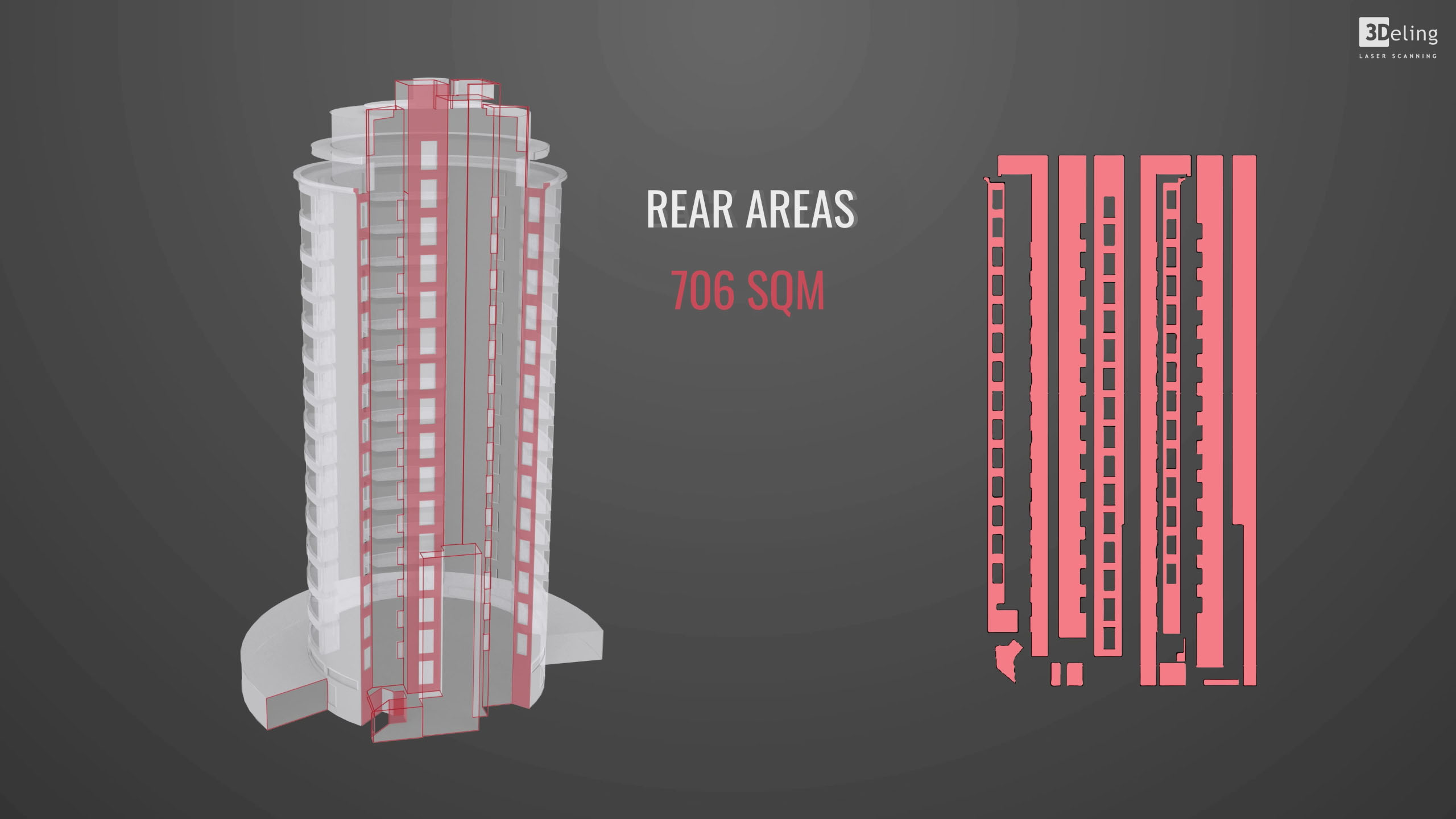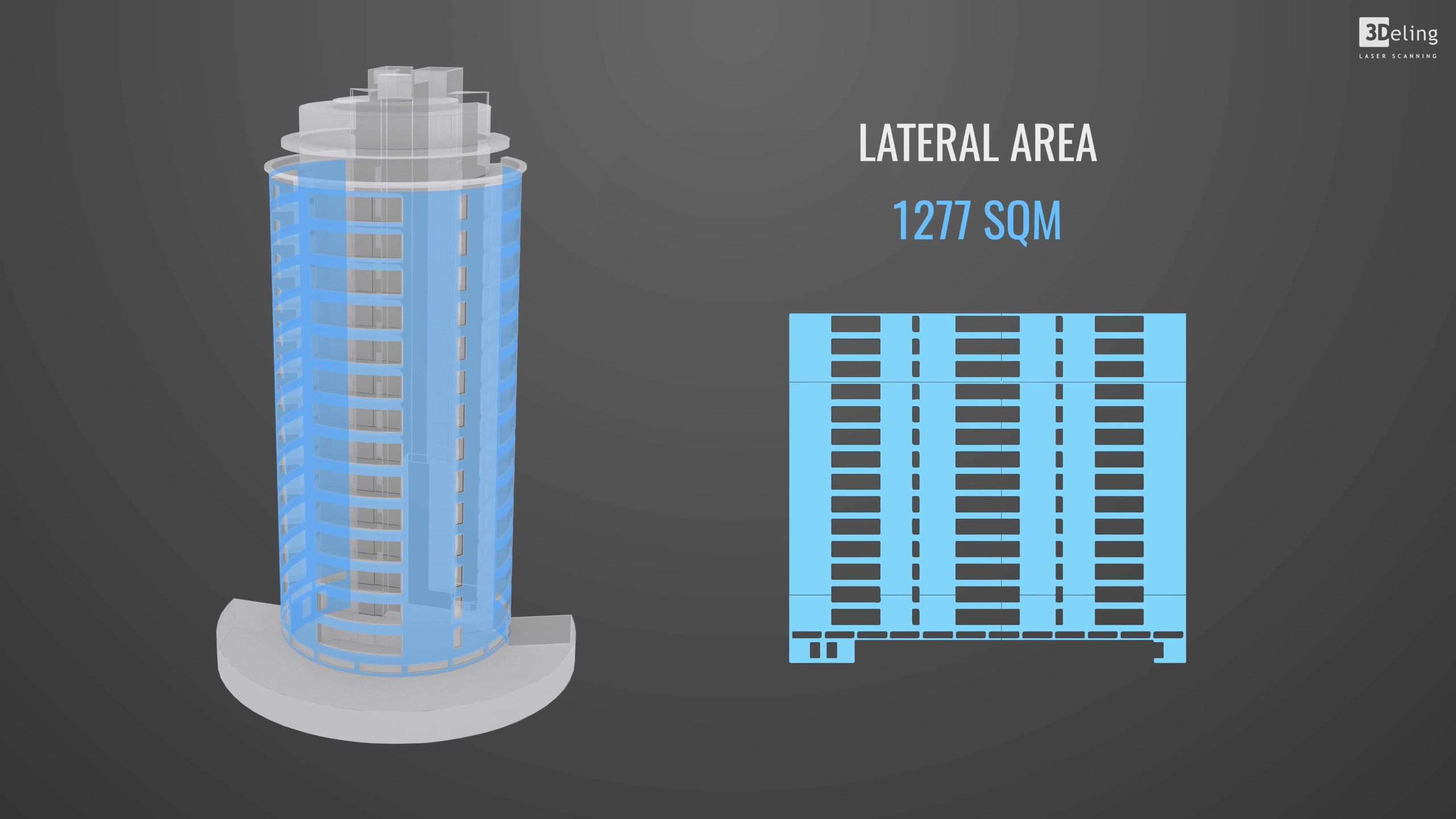 W pierwszej kolejności, przy pomocy skanera o dalekim zasięgu zeskanowana została elewacja zewnętrzna budynku. Następnie, dane ze skanera zostały połączone do jednego wspólnego układu współrzędnych i dzięki temu można było uzyskać spójną chmurę punktów obrazująca kształt całego budynku. Kolejny krokiem było stworzenie modelu bazującego na wspomnianej chmurze punktów. Praca ta została wykonana w programie MicroStation. Model 3D elewacji budynku podzielono na obszary ze względu na jego poszczególne typy, a każdy wydzielony model został rozwinięty na płaszczyznę w celu obliczenia jego powierzchni. Zakres całego projektu obejmował wszystkie części budynku. Wydzielono następujące obszary: ściana główna, ściany tylne, ściany na dachu oraz balkony, które również rozdzielone zostały pod względem typu. Ostateczne wyniki pomiarów przedstawiono w raporcie, który zawierał widoki izometryczne wydzielonych brył wraz z ich rozwinięciami na płaszczyzny 2D.