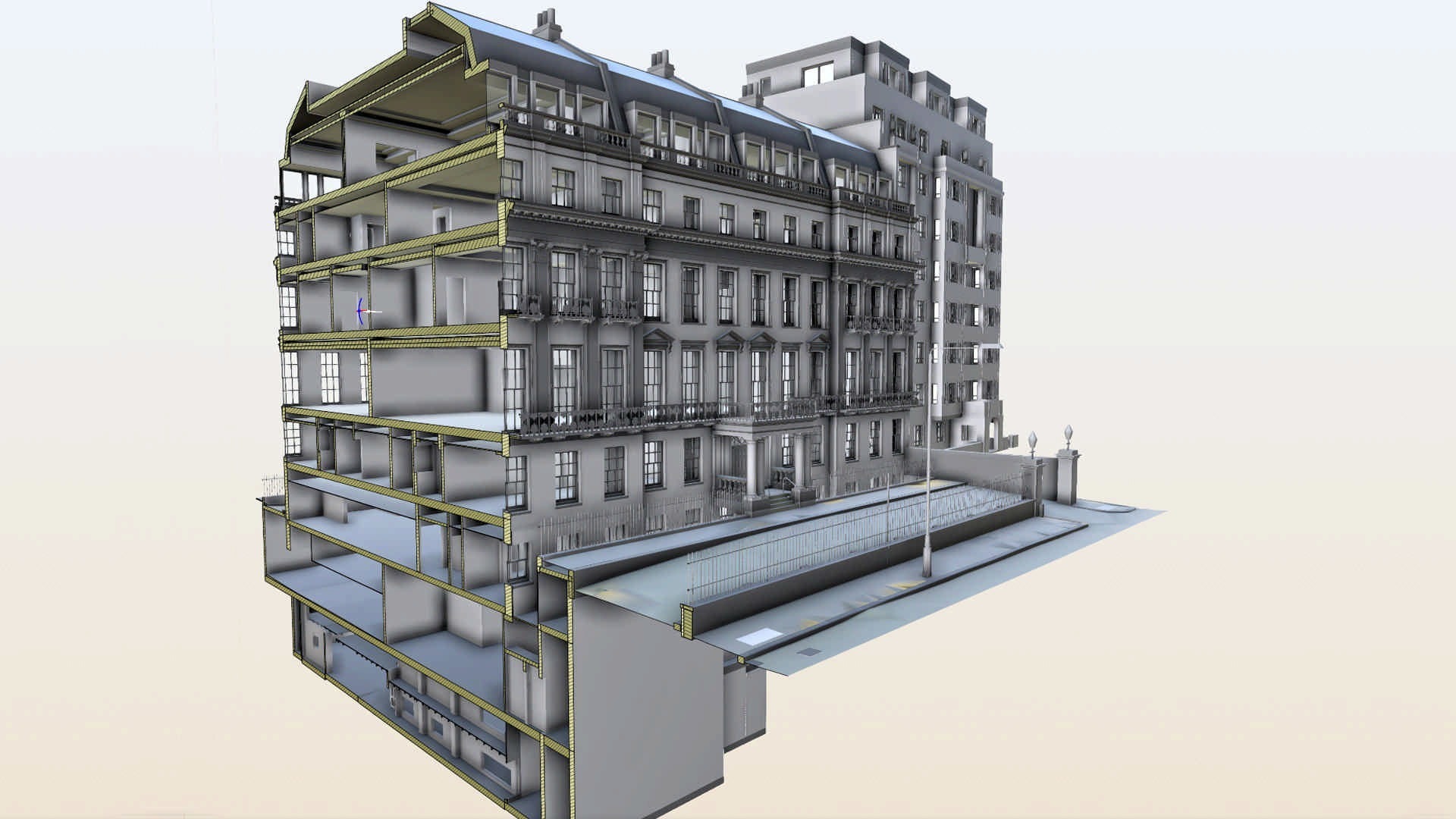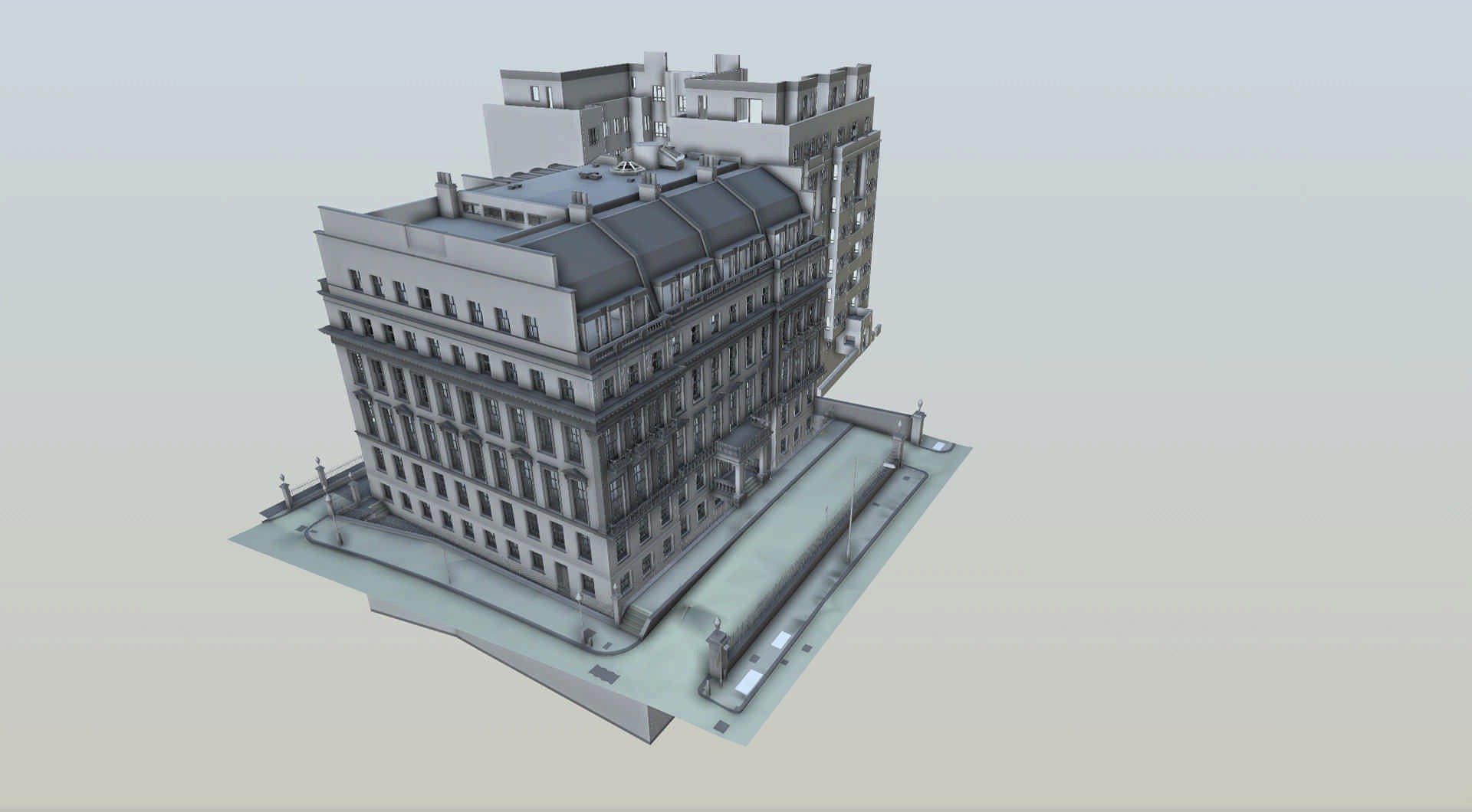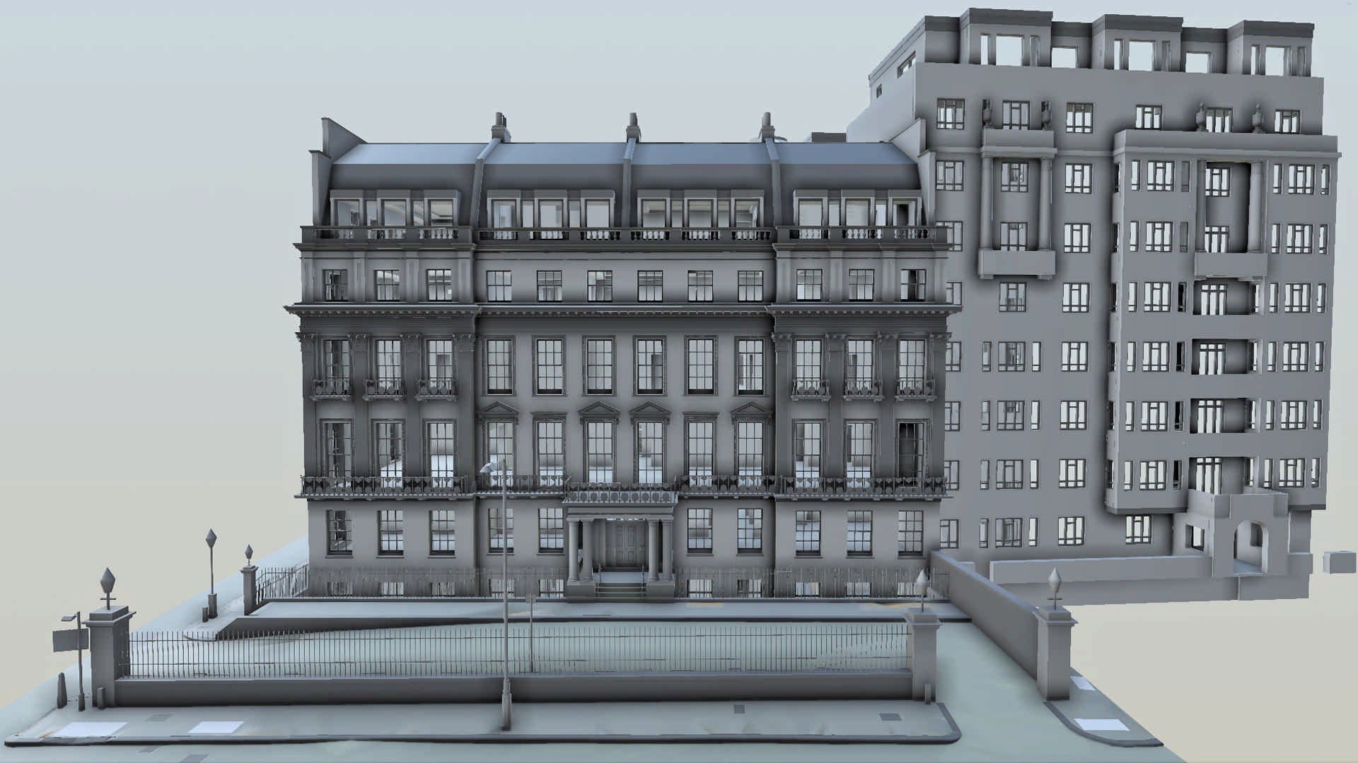 Obiektem projektu była, ujęta w wykazie klasy II rezydencja w stylu francusko-włoskim, zajmujaca powierzchnię 5110 m2. 3Deling został poproszony o ekspercką pomoc na wszystkich etapach nabywania i rozwoju tej rezydencji. Aby spełnić wymagania tego zamówienia opracowaliśmy prezentowany model BIM jako produkt finalny. Posiadłość pierwotnie stanowiły cztery domy wielorodzinne, ktore zostały ostatecznie scalone w jedną rezydencję. Klient planował przeprowadzenie szeroko zakrojonej wewnętrznej modernizacji i rekonfiguracji nieruchomości w ramach istniejącej konstrukcji budynku i fasady.
