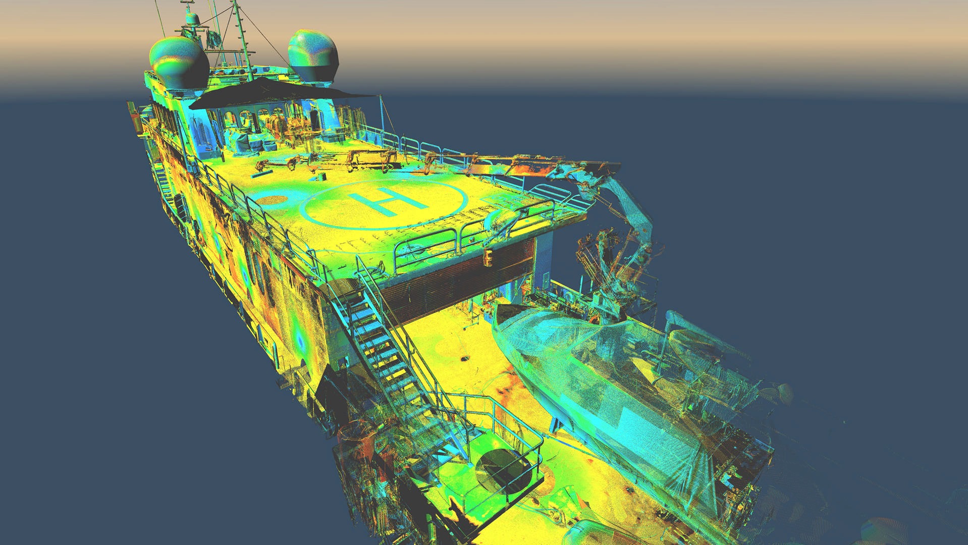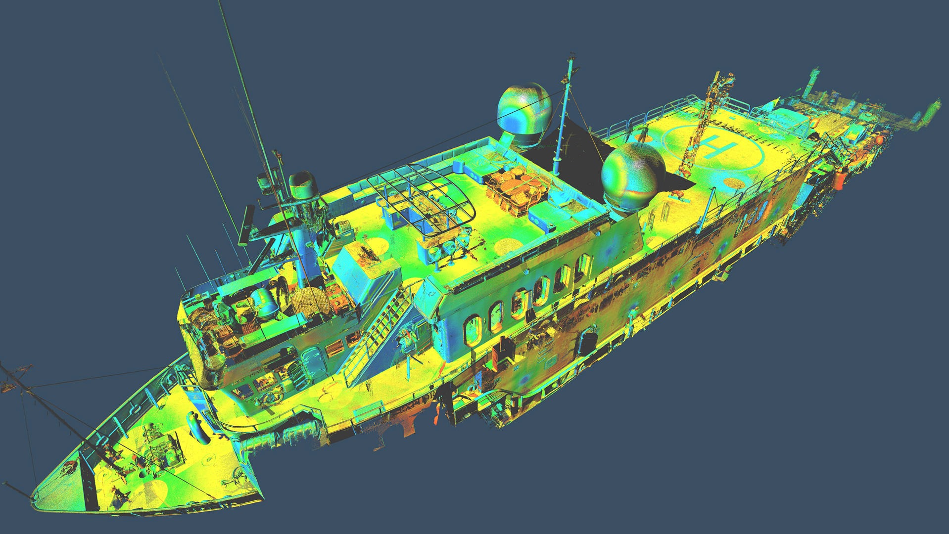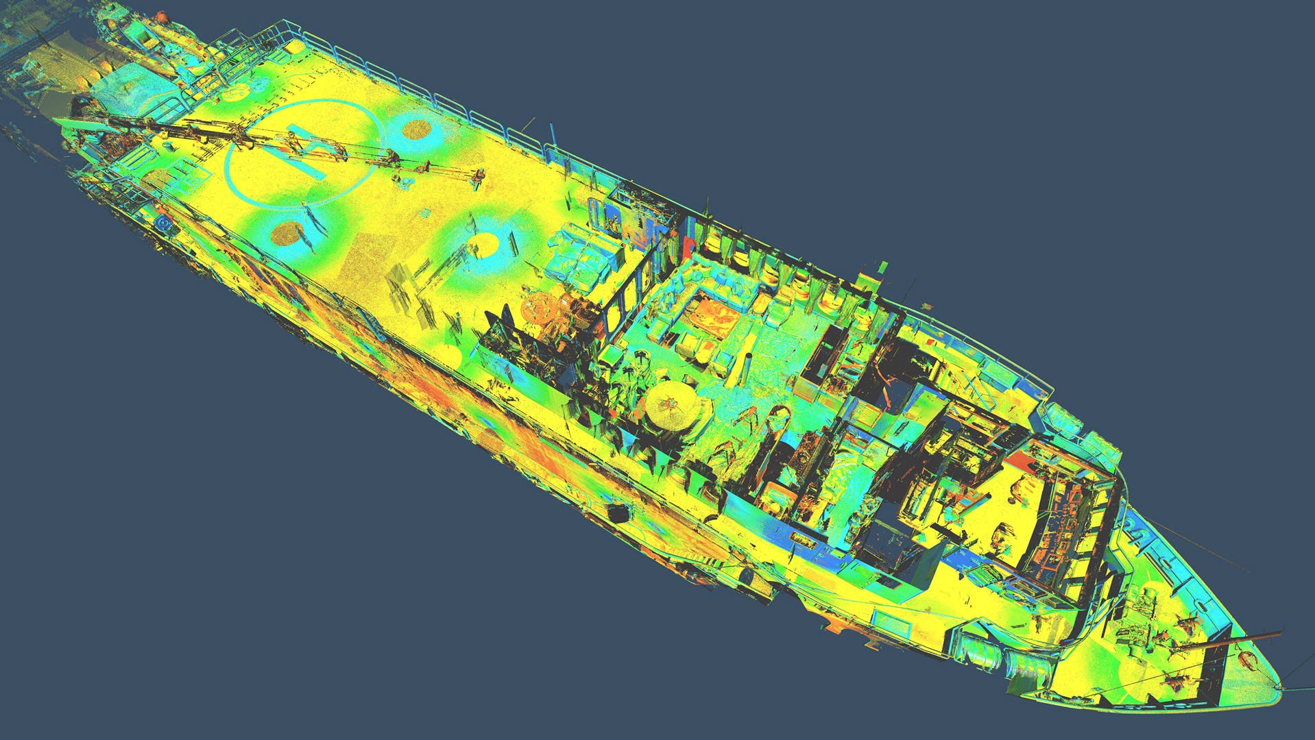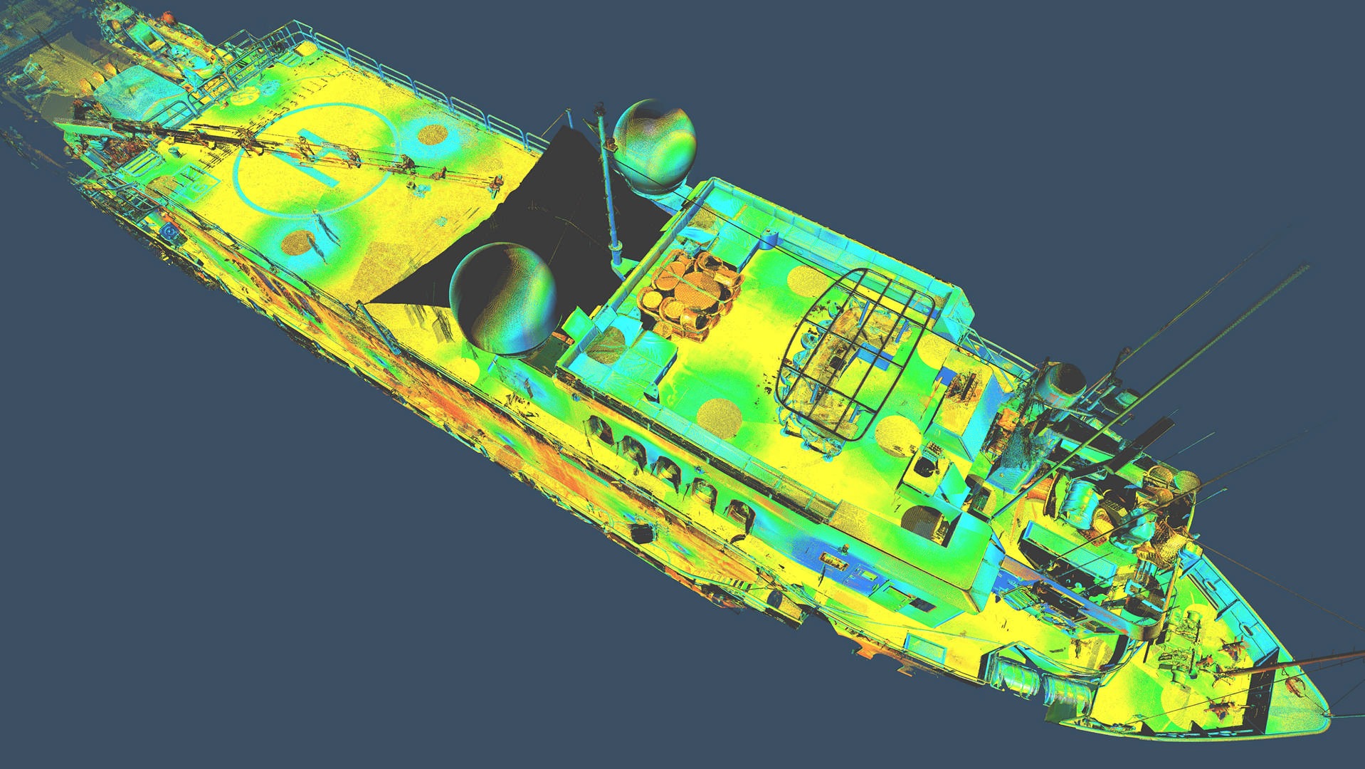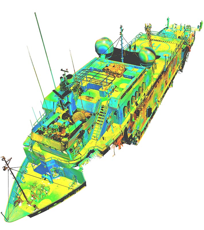 Statek nie posiadał aktualnej dokumentacji stąd klient zlecił nam pomiar metoda skaningu 3D. Klient planował budowę pokładu – lądowiska dla helikoptera. Dodatkowo zlecono też skanowanie przestrzeni komory silnikowej dla ewentualnych potrzeb remontowych w przyszłości. Wykonano około 150 pojedynczych stanowisk skanera. Pomiar musiał zostać wykonany z wyłączonym kompensatorem, ponieważ statek znajdował się na wodzie w ruchu.
