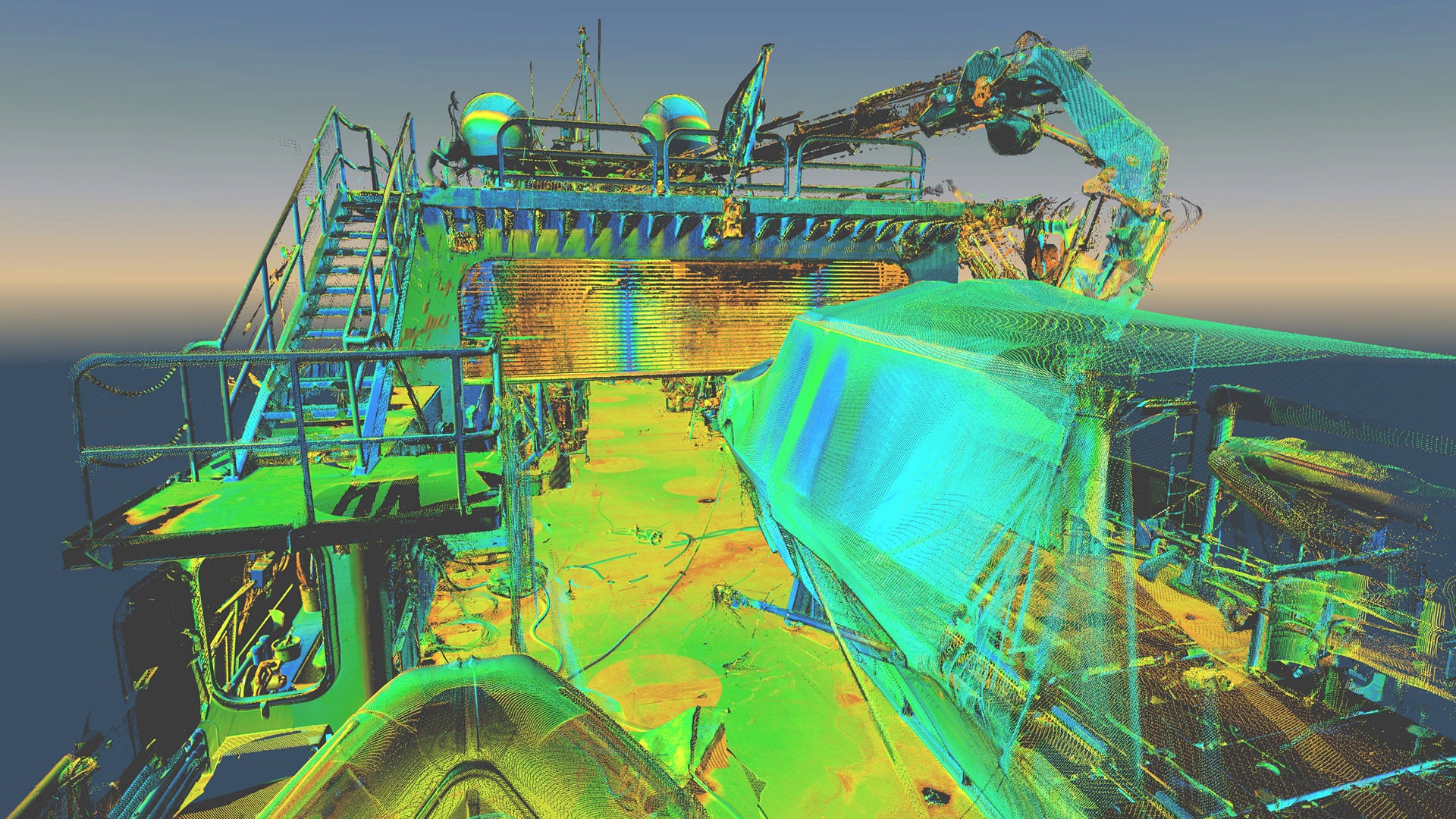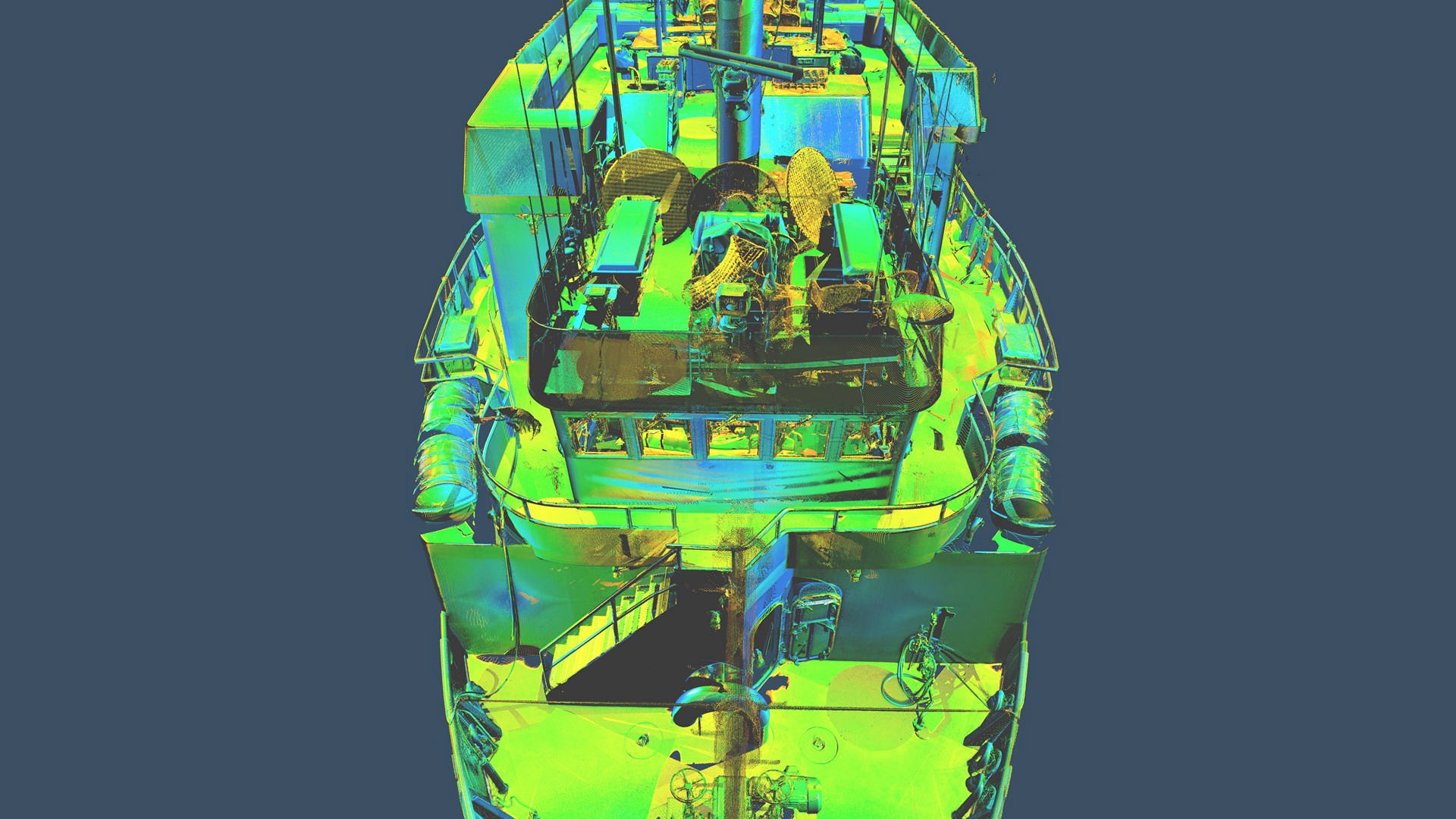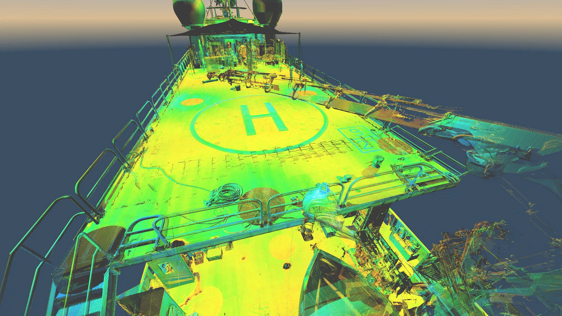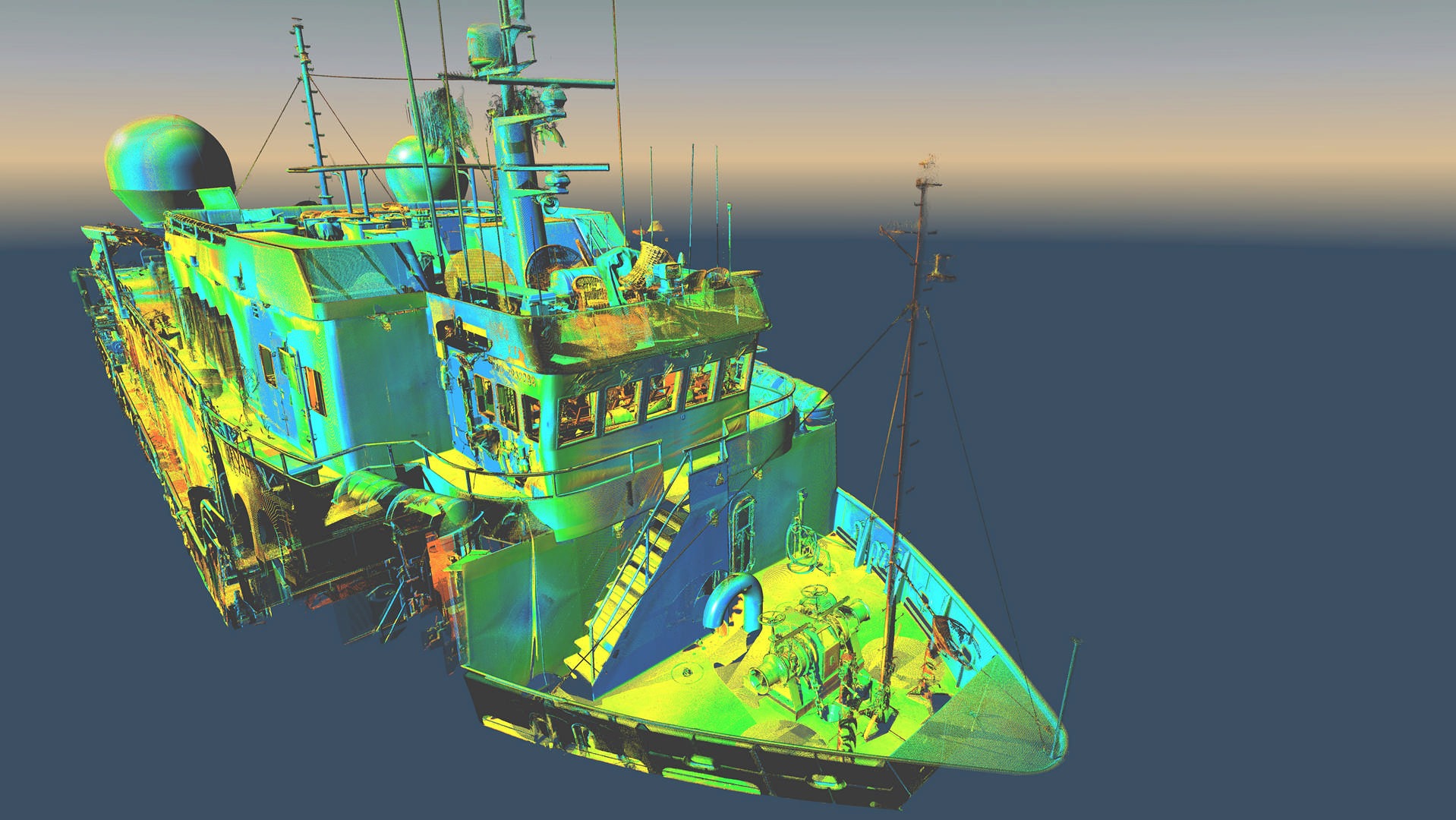 Statek nie posiadał aktualnej dokumentacji stąd klient zlecił nam pomiar metoda skaningu 3D. Klient planował budowę pokładu – lądowiska dla helikoptera. Dodatkowo zlecono też skanowanie przestrzeni komory silnikowej dla ewentualnych potrzeb remontowych w przyszłości. Wykonano około 150 pojedynczych stanowisk skanera. Pomiar musiał zostać wykonany z wyłączonym kompensatorem, ponieważ statek znajdował się na wodzie w ruchu.