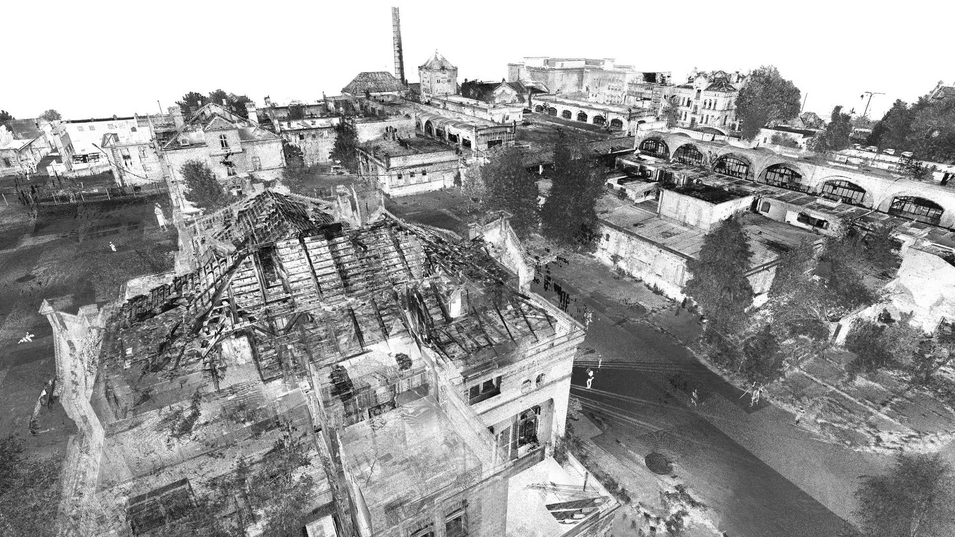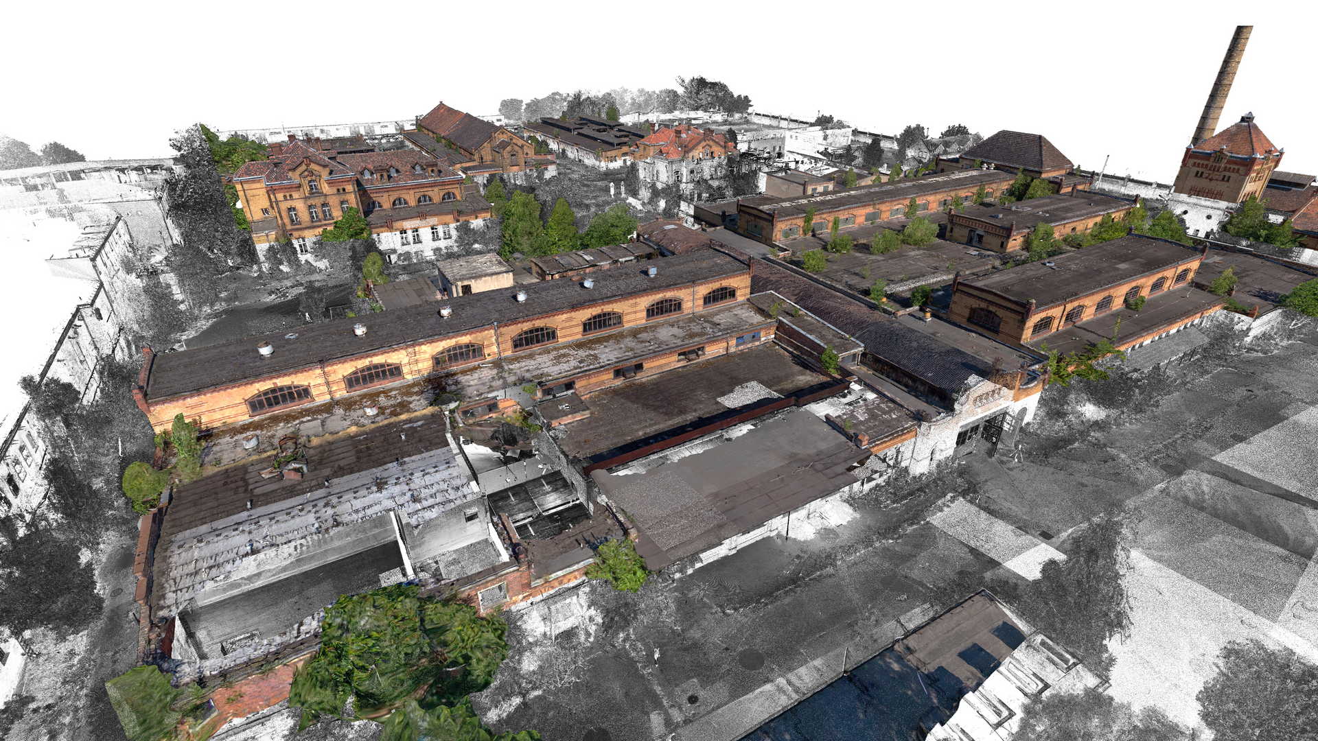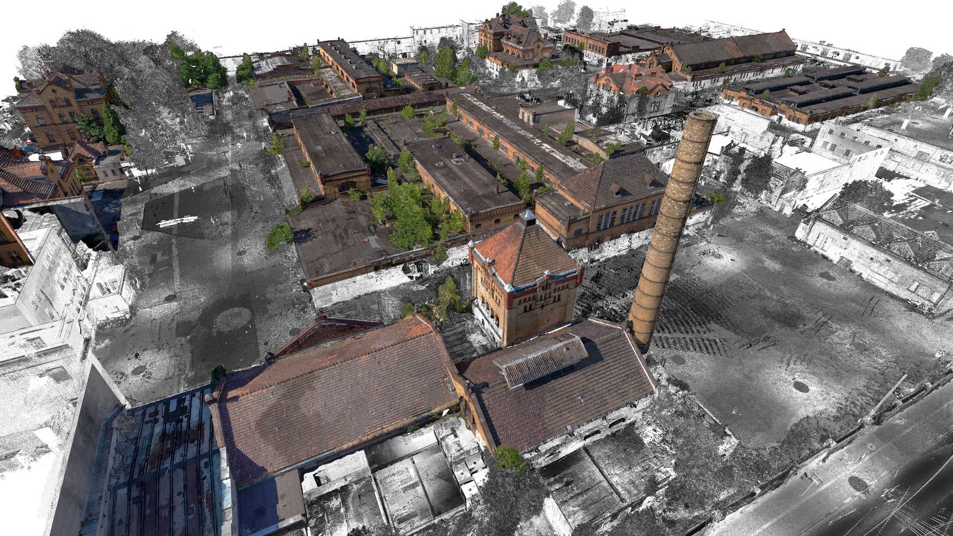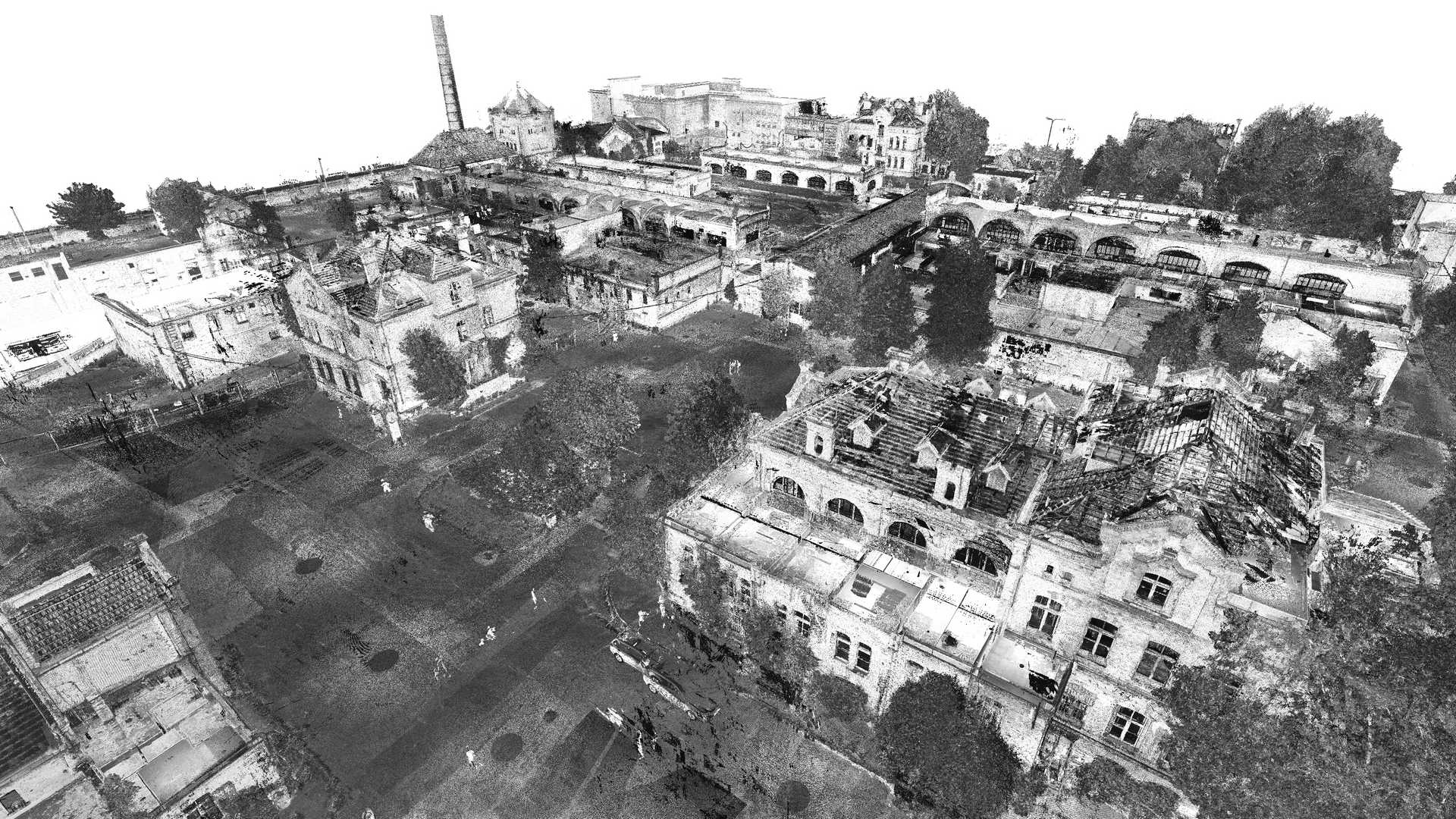 Pomiary obejmowały tradycyjny pomiar geodezyjny tachimetrem i GPS oraz pomiar skanerem laserowym. Dane ze skaningu naziemnego zostały dopełnione kolorową chmurą punktów uzyskaną po nalocie dronem. Zdecydowano się na użycie jak największej ilości bezinwazyjnych sposobów pozyskiwania danych, ponieważ wiele budynków groziło zawaleniem albo dostęp do nich był całkowicie niemożliwy.