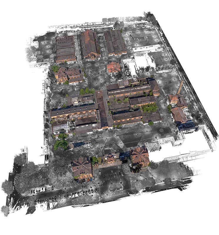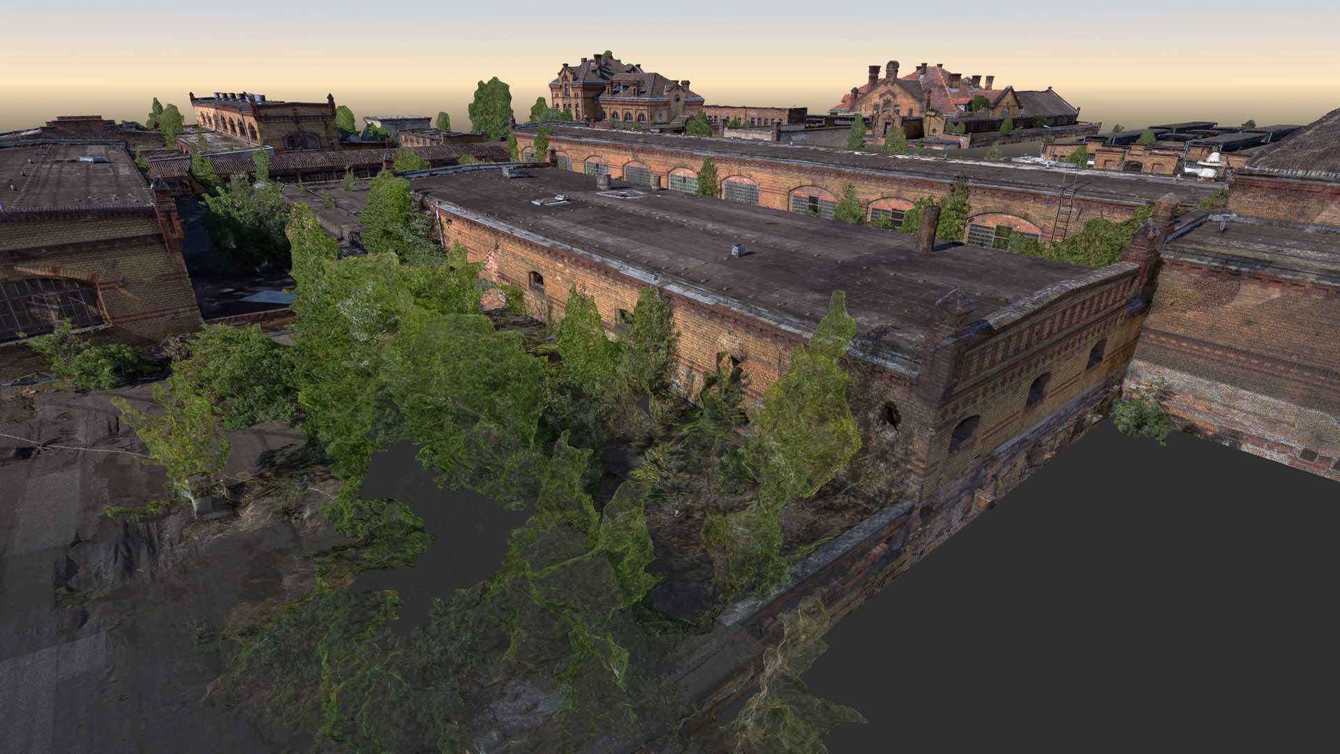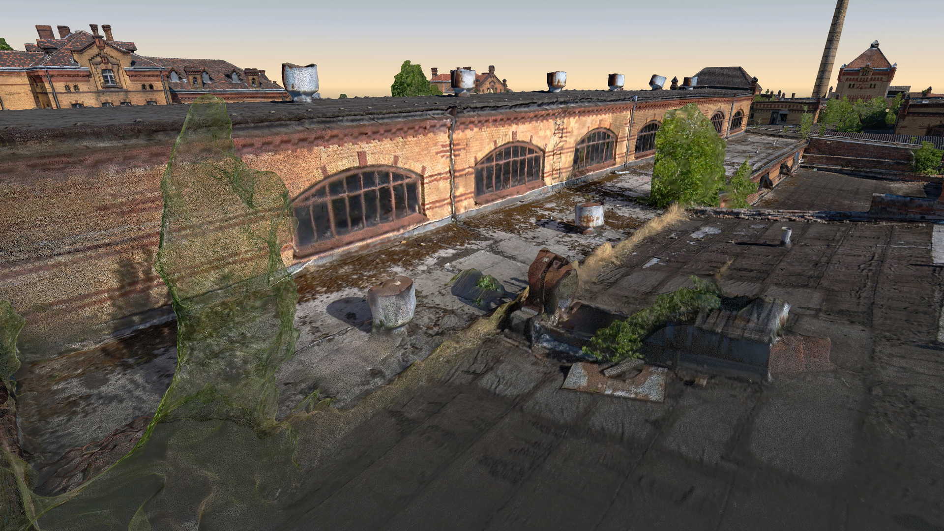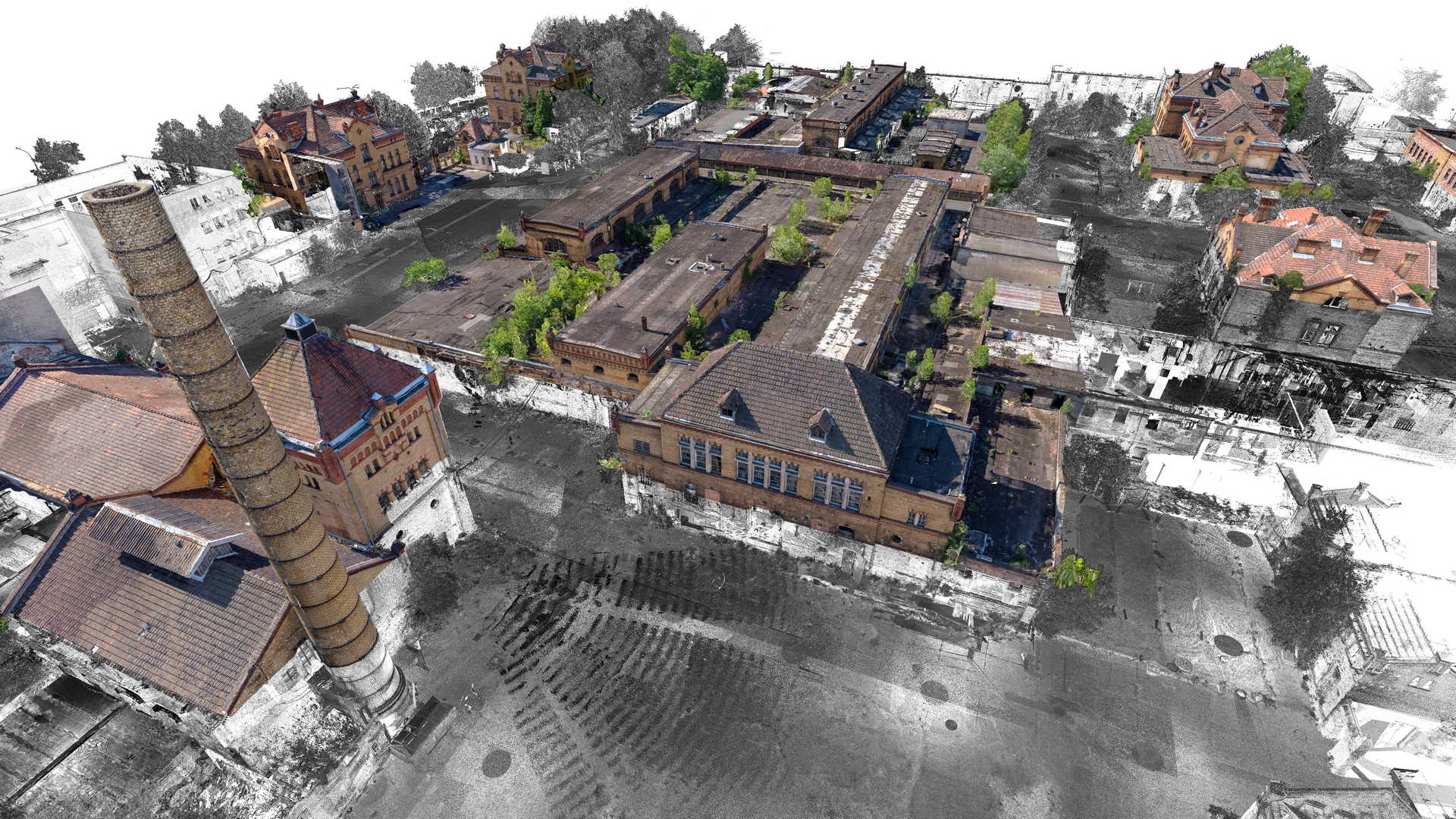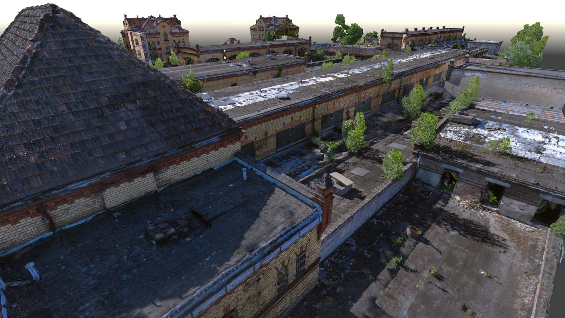 Pomiary obejmowały tradycyjny pomiar geodezyjny tachimetrem i GPS oraz pomiar skanerem laserowym. Dane ze skaningu naziemnego zostały dopełnione kolorową chmurą punktów uzyskaną po nalocie dronem. Zdecydowano się na użycie jak największej ilości bezinwazyjnych sposobów pozyskiwania danych, ponieważ wiele budynków groziło zawaleniem albo dostęp do nich był całkowicie niemożliwy.