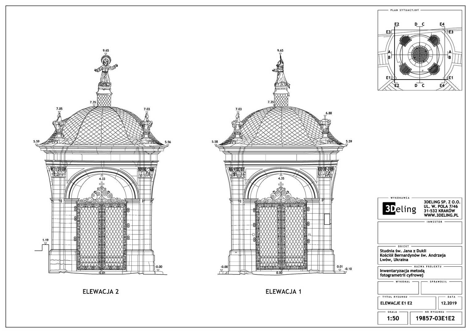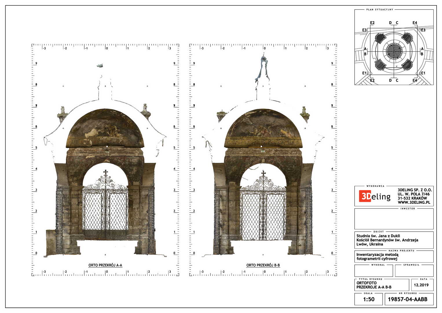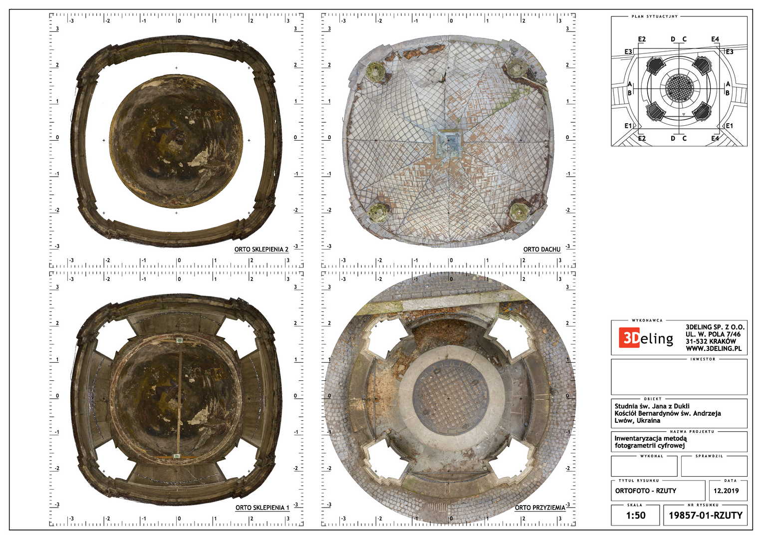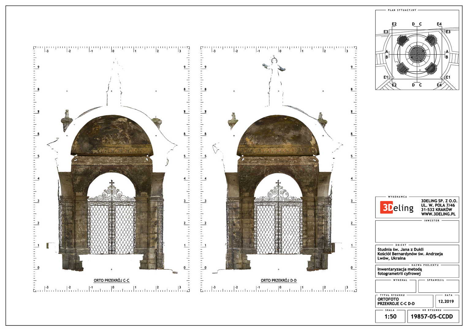 Efektem inwentaryzacji jest wektorowa dokumentacja CAD w postaci przekrojów, widoków elewacji oraz planu sytuacyjnego. Dodatkowo bazując na modelu siatkowym o wysokiej rozdzielczosci wygenerowano ortofoto czyli zdjęcia metryczne każdej elewacji. Model mesh 3D, po stosownym zredukowaniu siatki trójkątków do tzw. low-poly jest gotowy do publikacji na serwisach takich jak sketchfab. Wcześniejsza surowa wersja modelu siatkowego została użyta do wyrenderowania animacji obiektu, które opublikowaliśmy na serwisie Youtube.