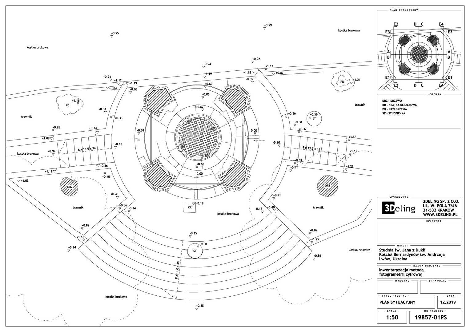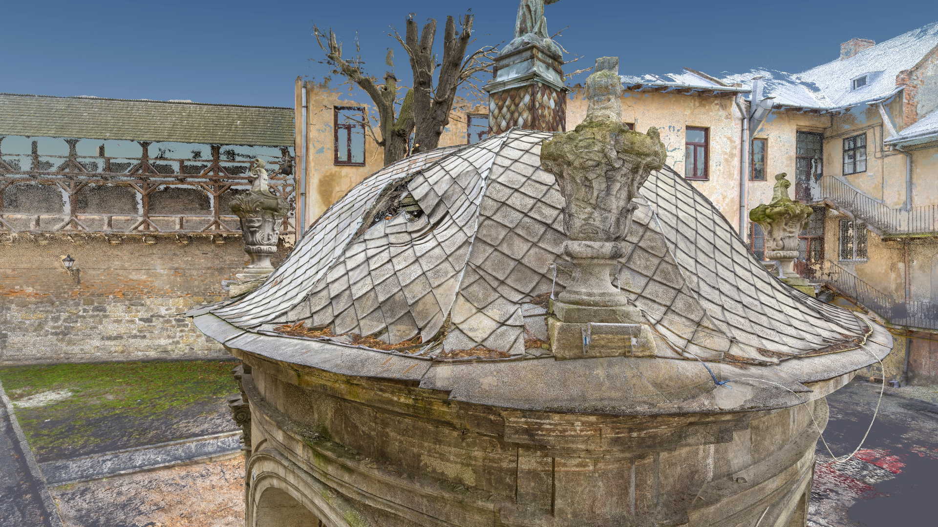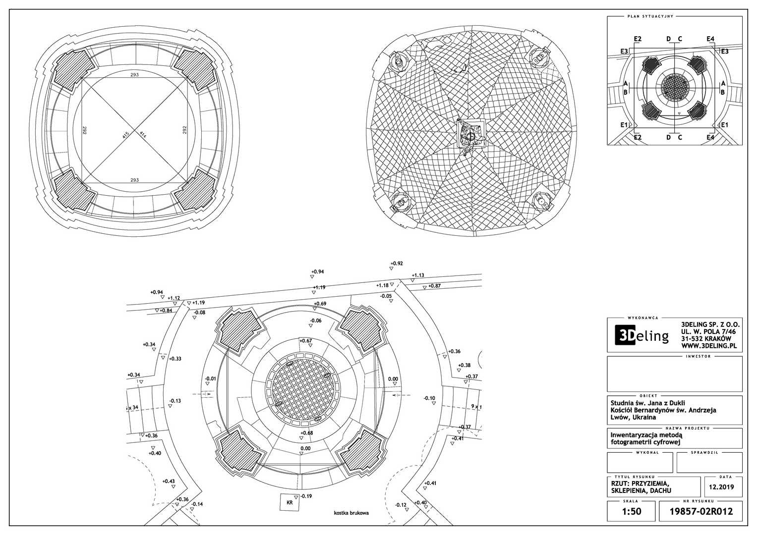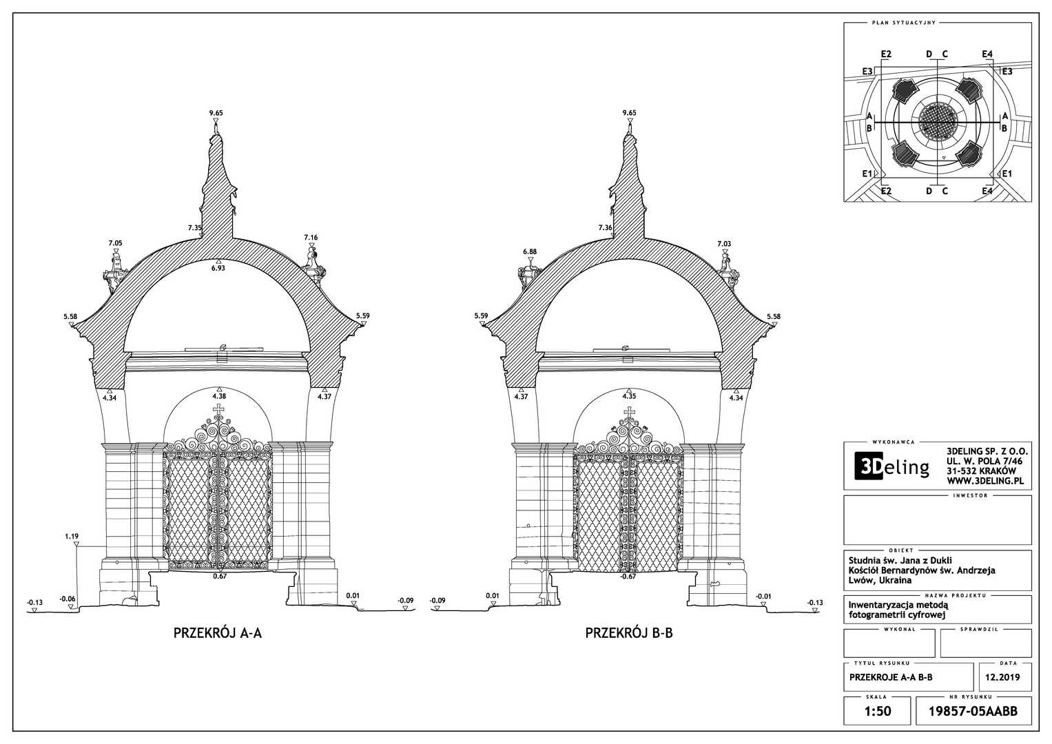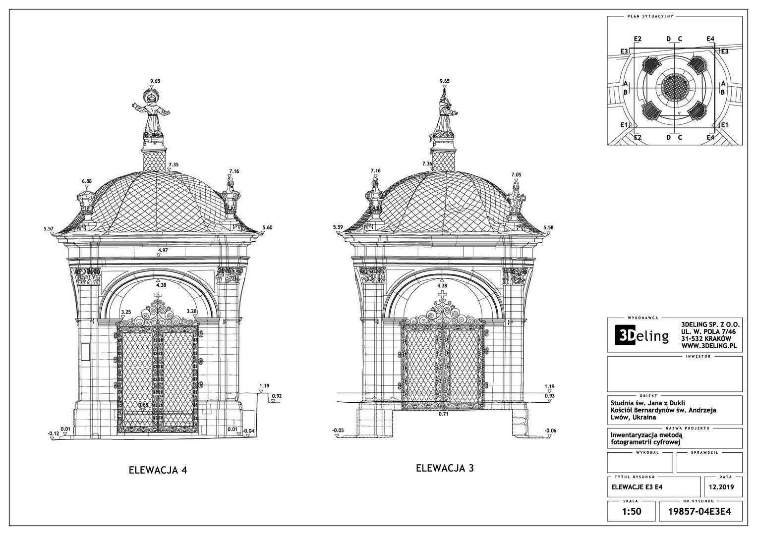 Efektem inwentaryzacji jest wektorowa dokumentacja CAD w postaci przekrojów, widoków elewacji oraz planu sytuacyjnego. Dodatkowo bazując na modelu siatkowym o wysokiej rozdzielczosci wygenerowano ortofoto czyli zdjęcia metryczne każdej elewacji. Model mesh 3D, po stosownym zredukowaniu siatki trójkątków do tzw. low-poly jest gotowy do publikacji na serwisach takich jak sketchfab. Wcześniejsza surowa wersja modelu siatkowego została użyta do wyrenderowania animacji obiektu, które opublikowaliśmy na serwisie Youtube.