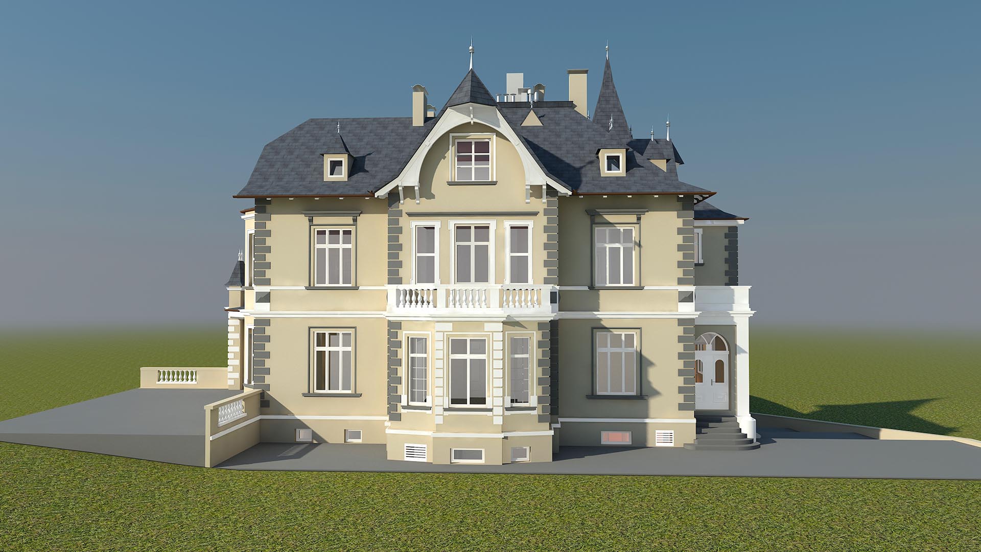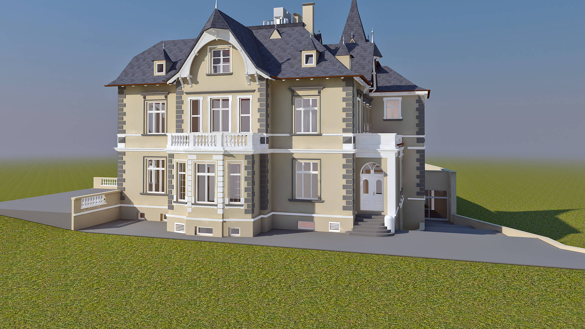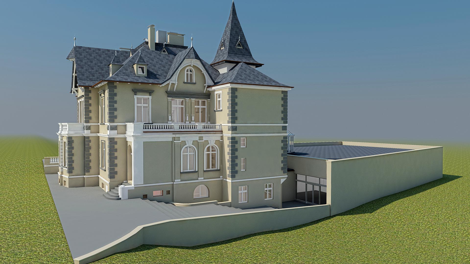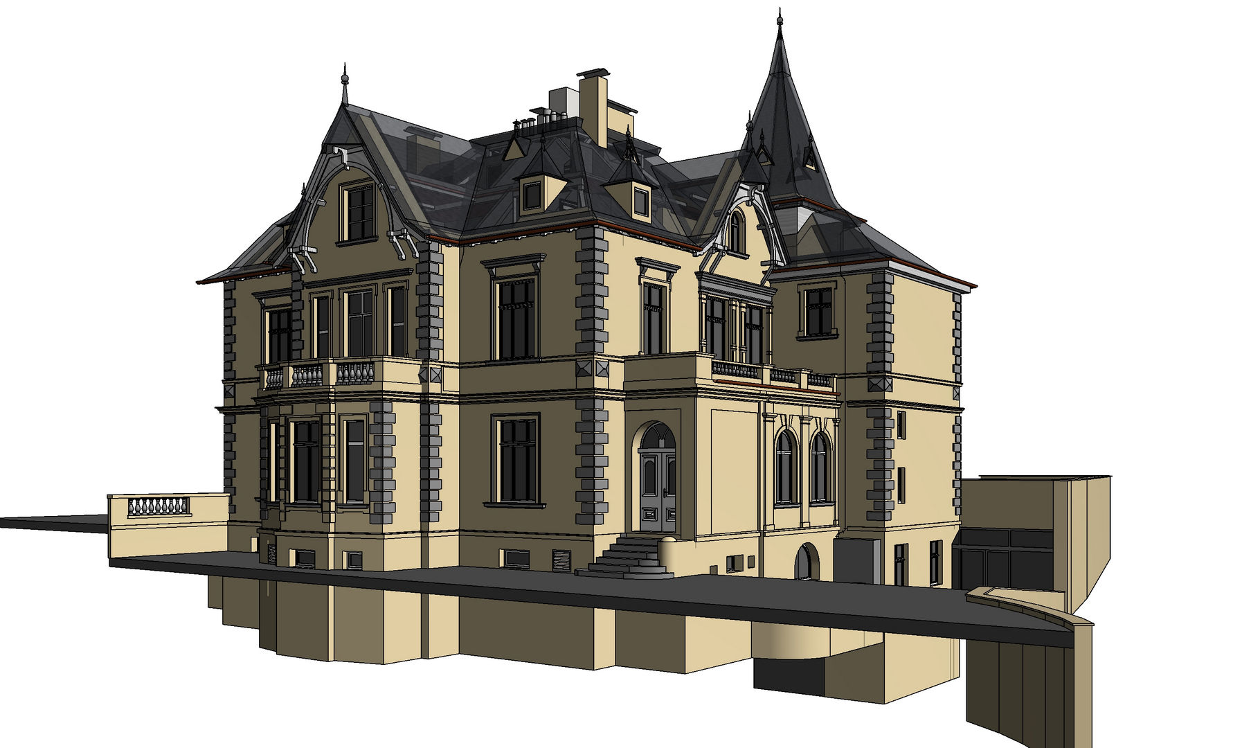 Jeden z nielicznych jak dotąd realizowanych projektów z zakresu BIM, na rynek Polski. Obiekt to zabytkowa willa do gruntownej przebudowy. Klient zlecił kompleksowe skanowanie obiektu na około 300 pojedynczych stanowiskach wraz z opracowaniem modelu 3D w oprogramowaniu Autodesk Revit (model BIM). Na podstawie modelu BIM, na poziomie szczegółowości LoD 3, wykonano dokumentację 2D. Obiekt złożony i niezwykle pracochłonny ze względu na niebanalna konstrukcję. Projekt okazał się bardziej wymagający niż zakładano na początku, przede wszystkim ze względu na czas potrzebny do pełnego opracowania. Jednakże efekt końcowy był bardzo satysfakcjonujący.