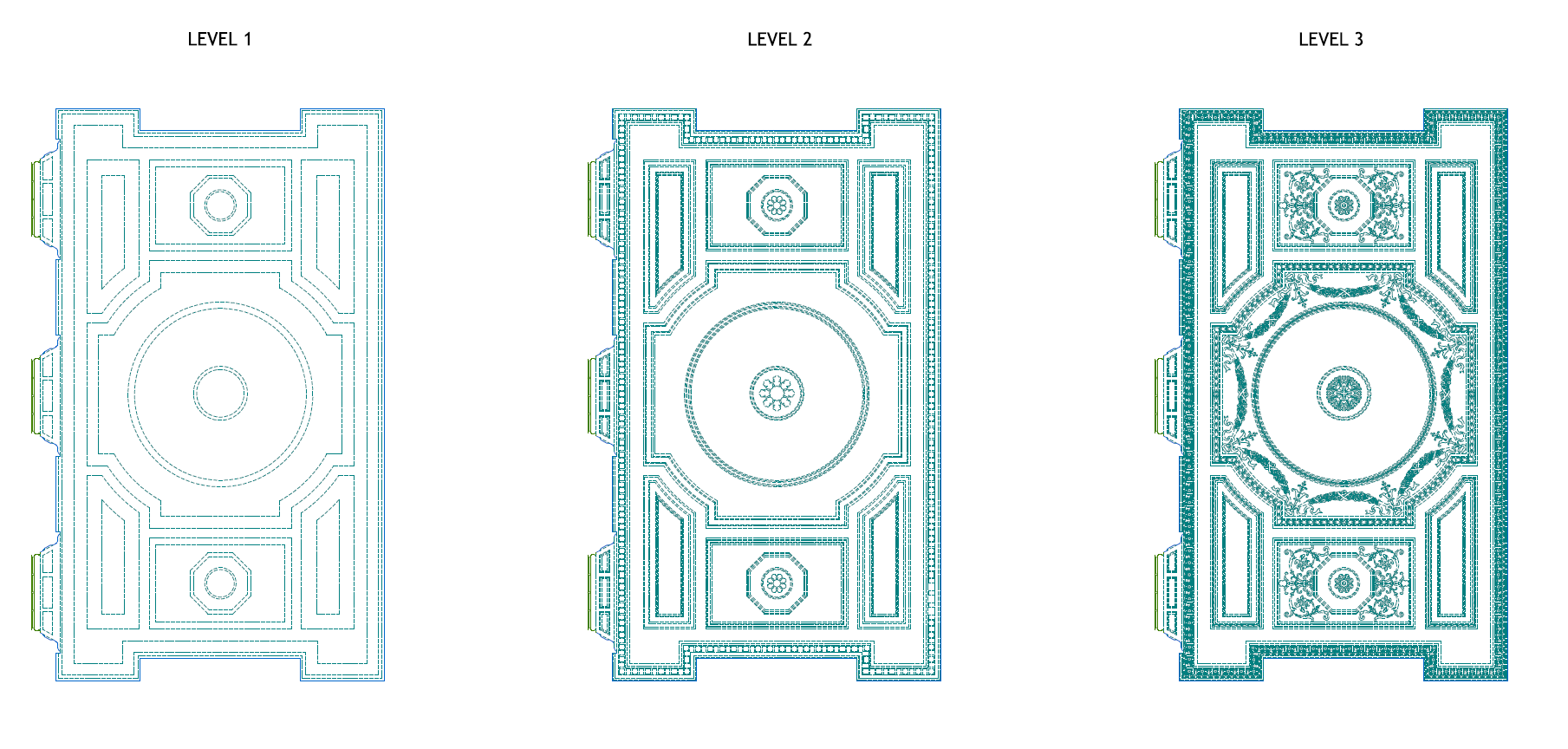 Elementy dekoracyjne typu gzymsy, kominki, płaskorzeźby pokazane są w maksymalnym odwzorowaniu szczegółów.