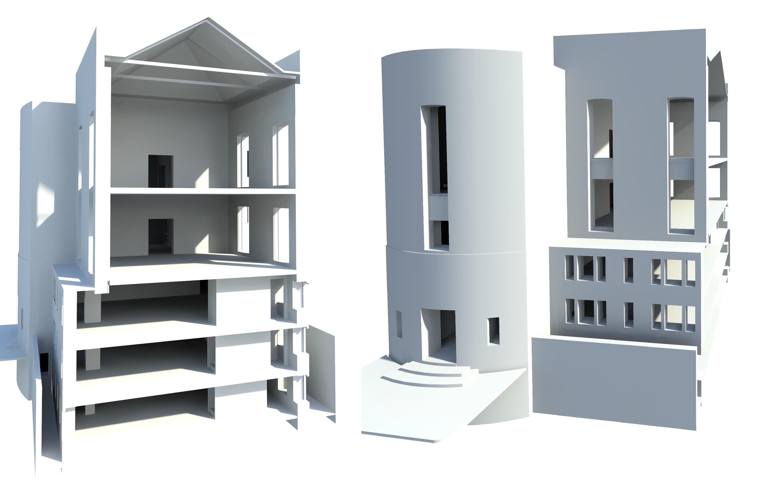 model zawiera najważniejsze elementy konstrukcyjne i otwory w budynku, w tym stropy, słupy, belki i otwory drzwi i okien w podstawowej formie